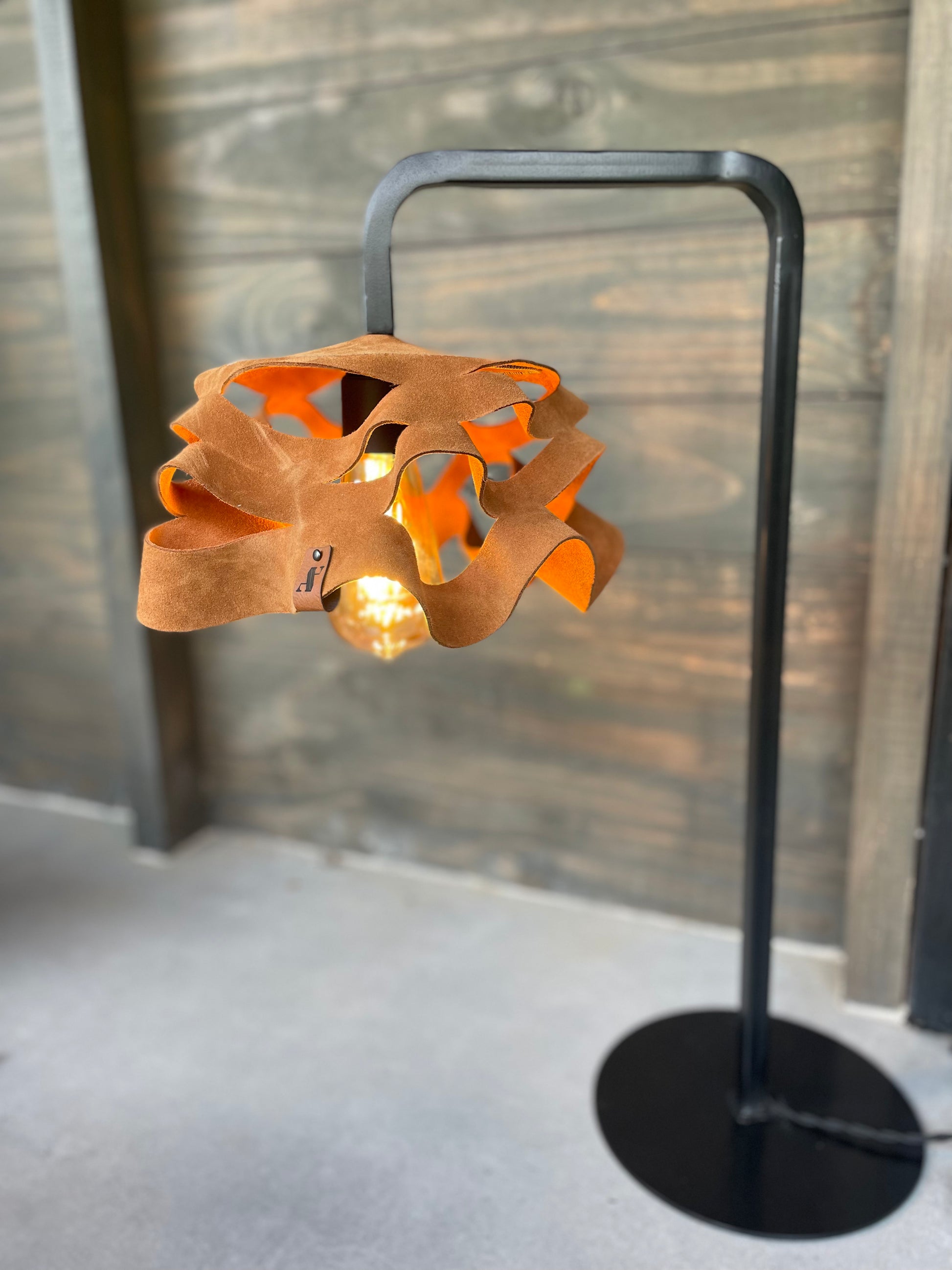 Estoy hecha a mano por mis diseñadoras, con un tejido natural llamado cuero. Dandole modernidad y atemporalidad. Con un pie de fierro pintado con pintura negra mate electroestática