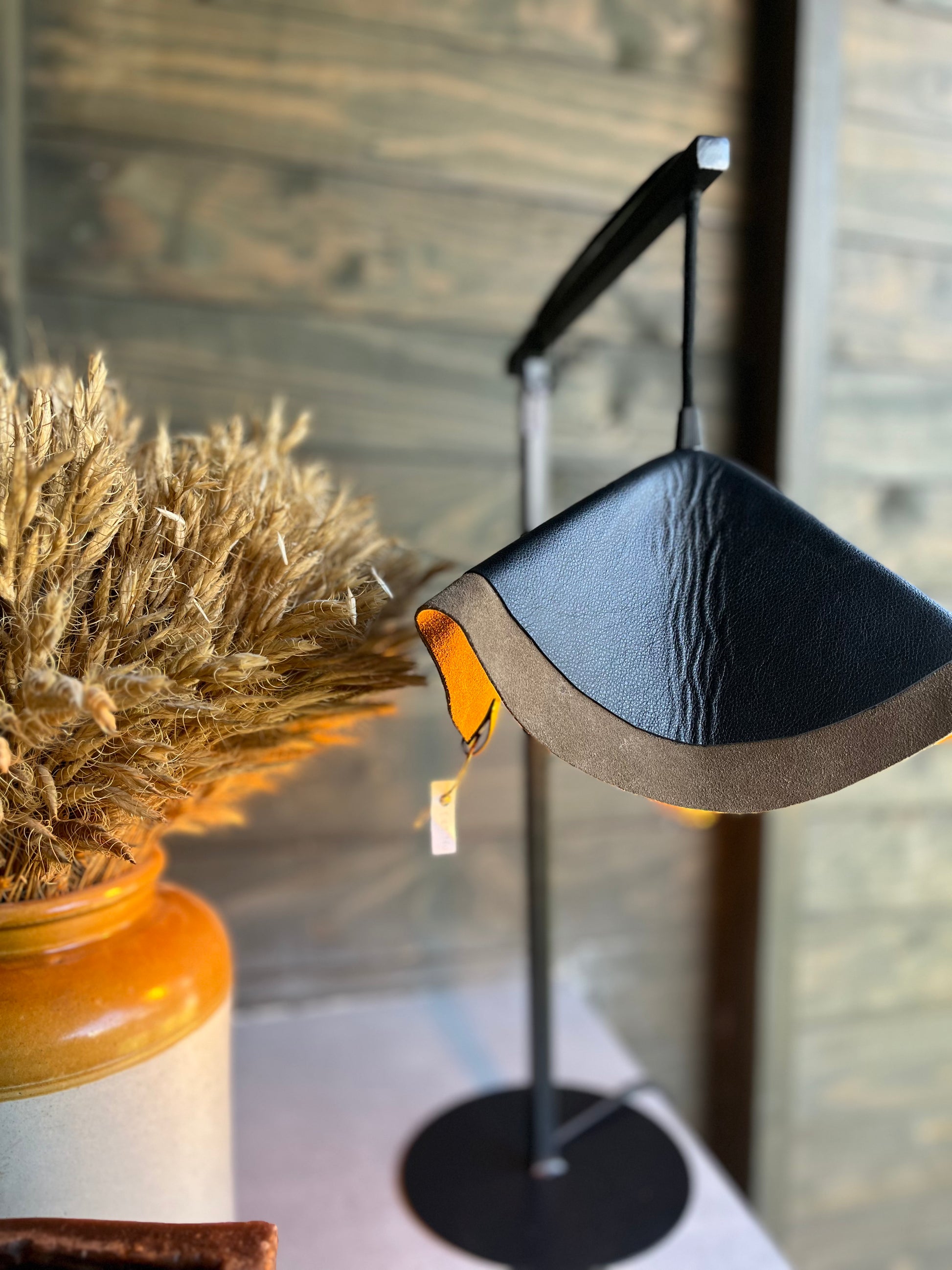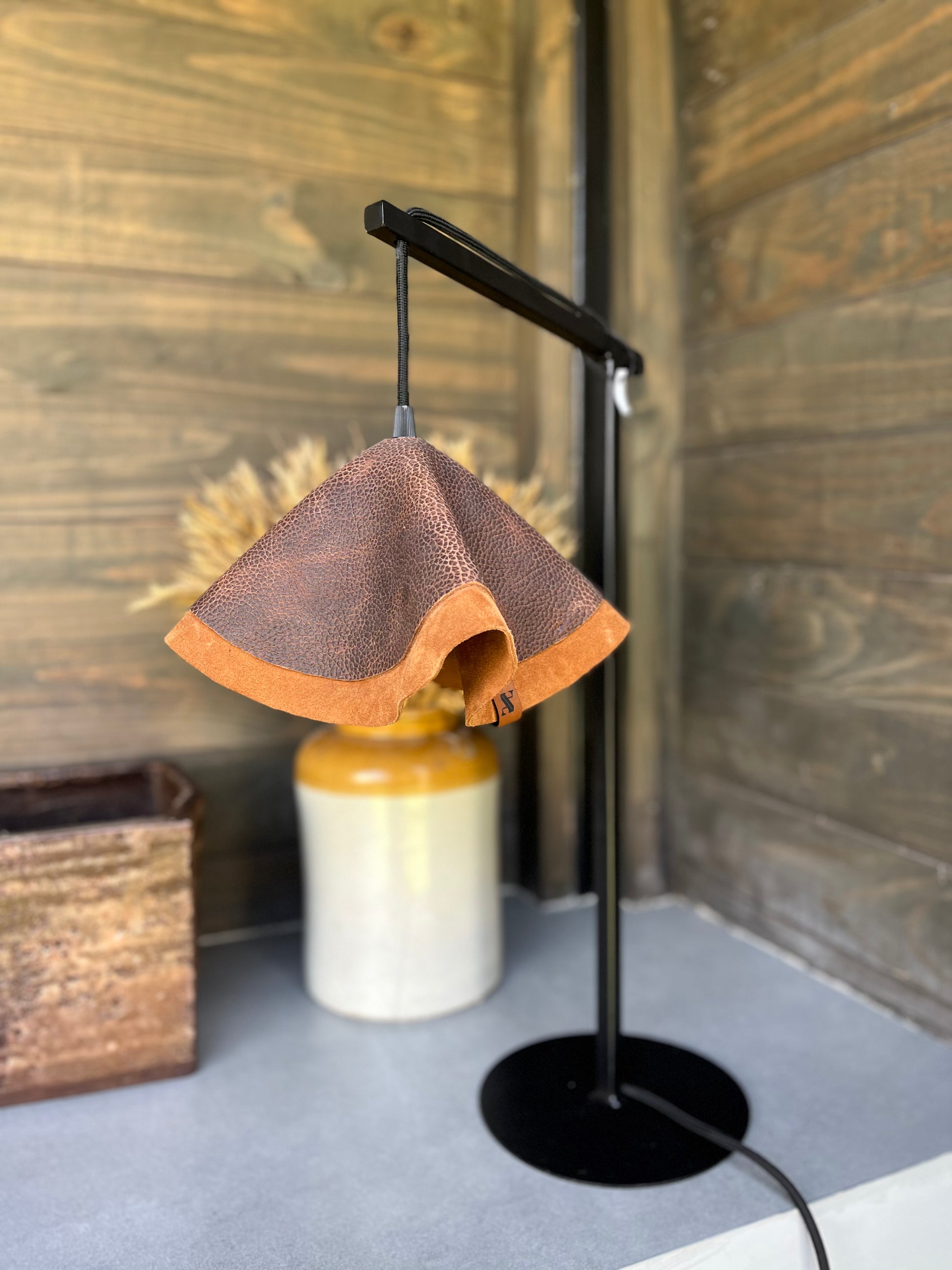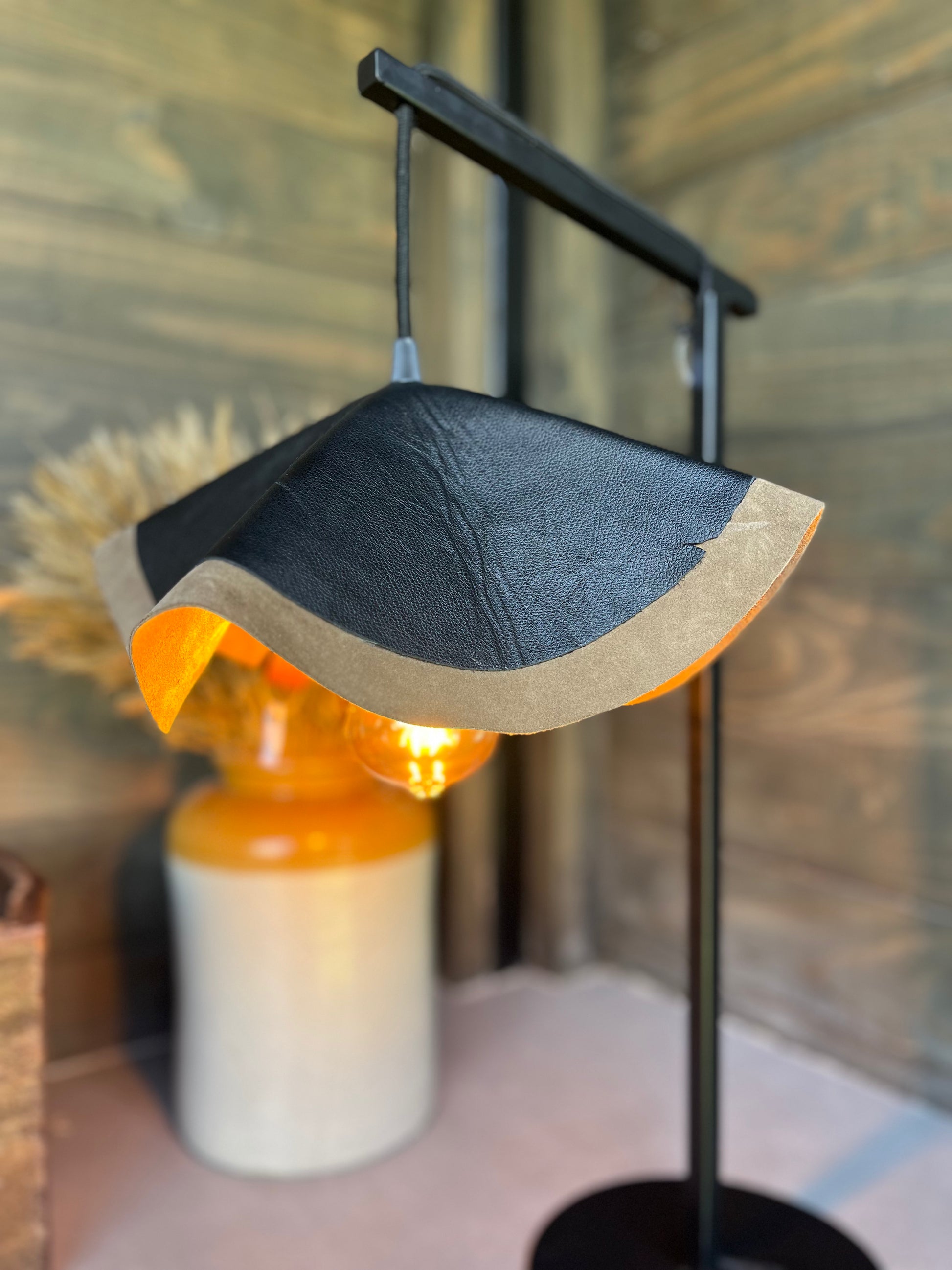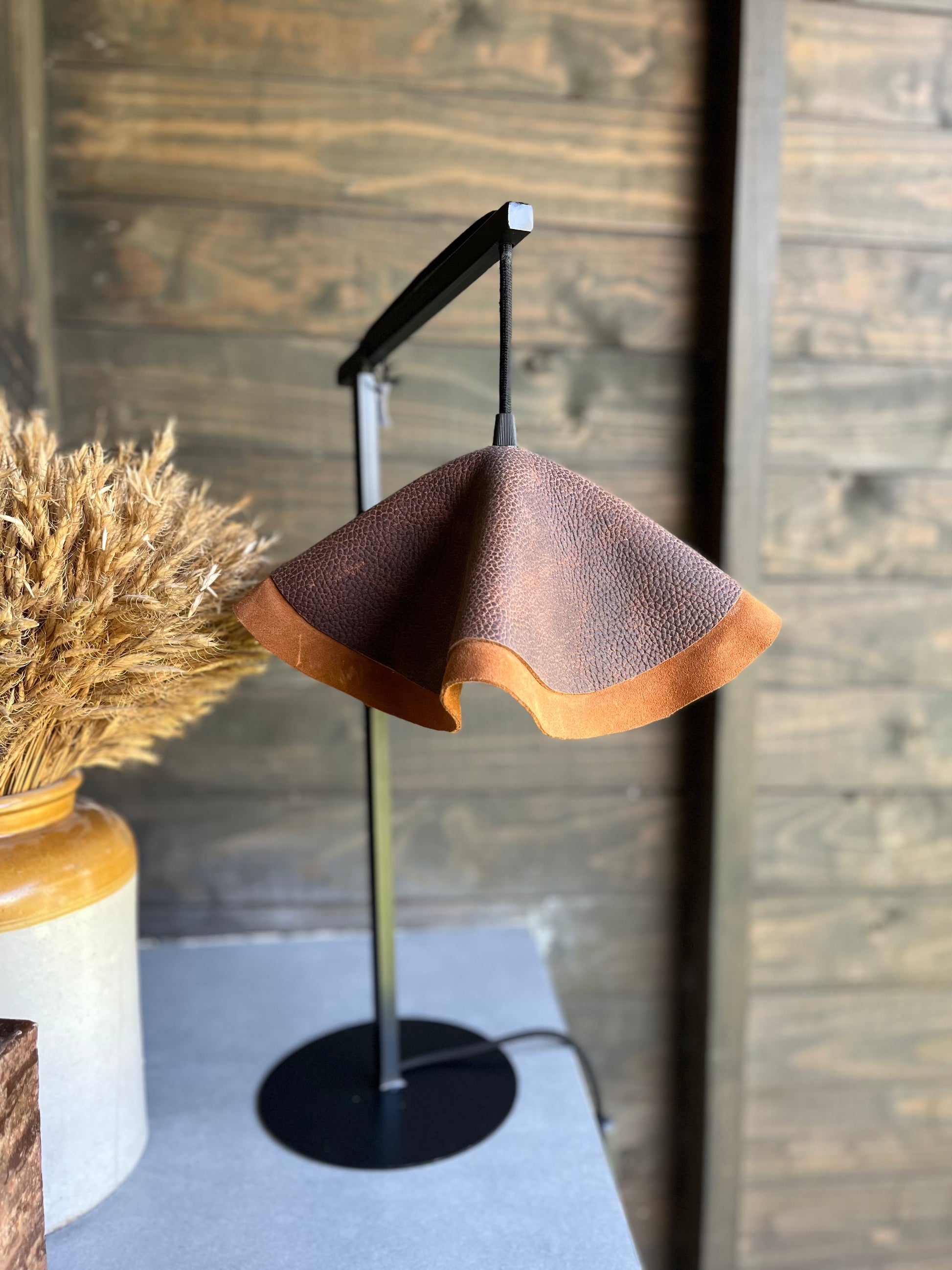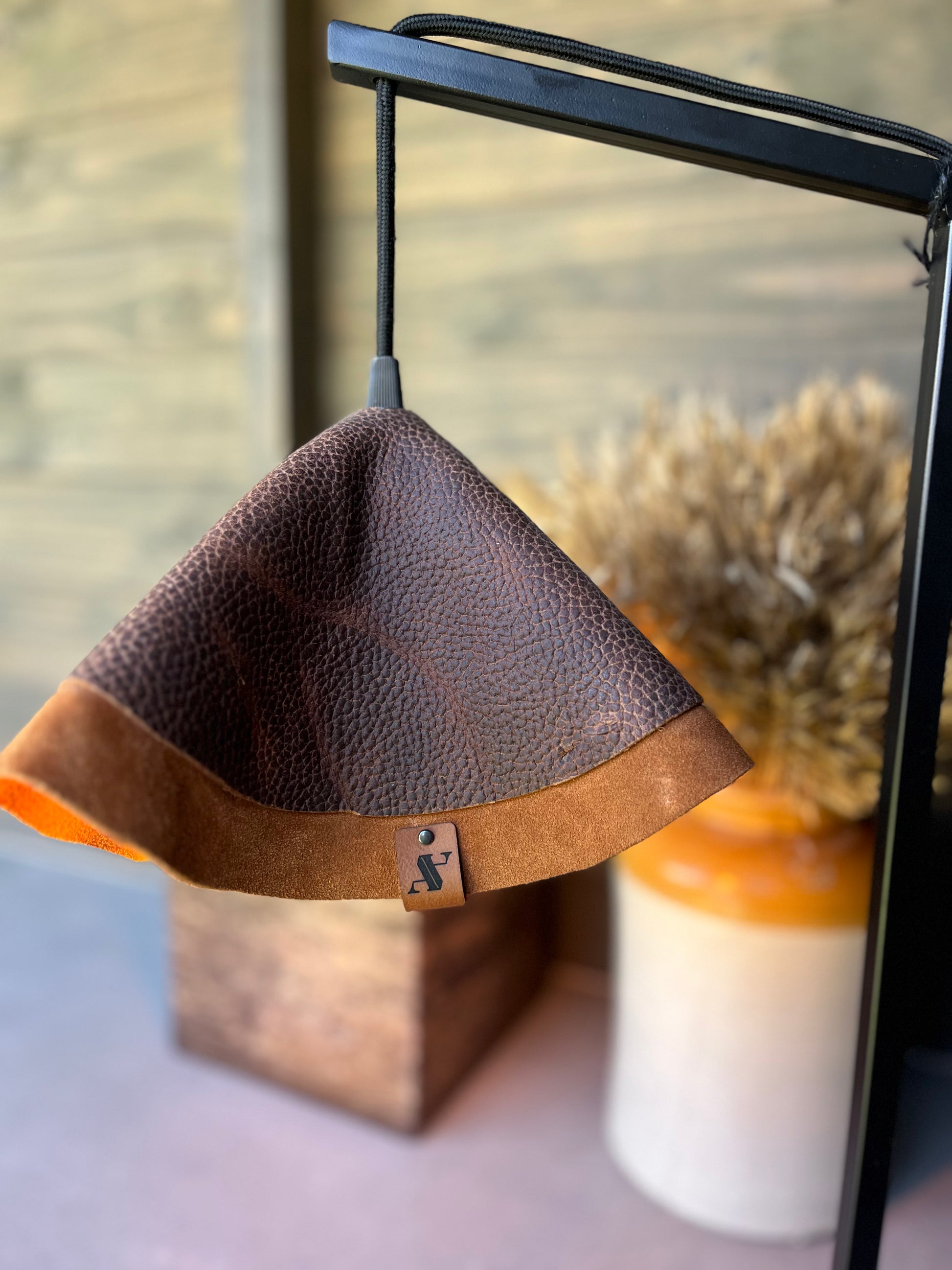 Estoy hecha a mano por mis diseñadoras, con un tejido natural llamado cuero. Dandole modernidad y atemporalidad. Con un pie de fierro pintado con pintura negra mate electroestática
